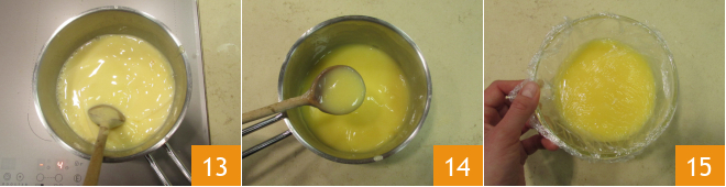 Stir and cook over moderate heat 13 until the cream thickens completely 14. Pour the cream into a bowl, cover with plastic wrap, and let it cool 15, first at room temperature and then in the fridge.