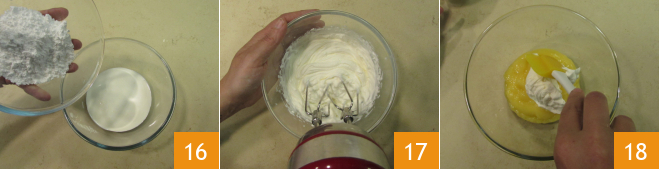 Pour the very cold cream and powdered sugar into a bowl 16 and whip it with electric beaters 17. Gently fold the whipped cream into the now-cold lemon cream 18 using gentle motions from bottom to top.
