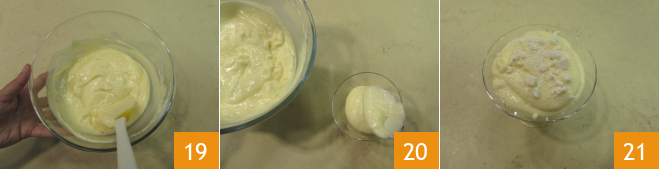 Once you have a homogeneous cream 19, assemble the cups: take glass cups about 4 inches (10 cm) in diameter, fill them with cream 20, and crumble some meringue on top 21.