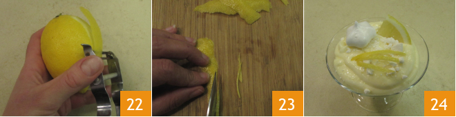 Use a peeler to remove the lemon zest 22 and cut it into strips 23. Garnish with the zest strips, a lemon slice, and a whole meringue. Serve the cups with lemon cream and meringues immediately 34.