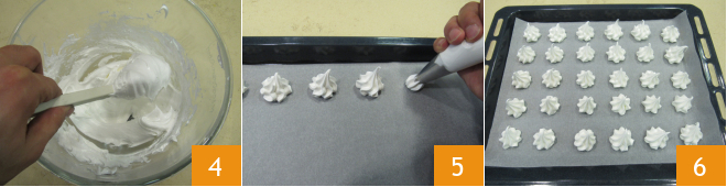 Continue working until the egg whites form stiff, glossy peaks 4. Put the meringue mixture into a piping bag and pipe dollops about 0.5 inches (1.5 cm) onto a baking sheet lined with parchment paper 5. If they're small, the meringues will cook faster 6. With the indicated quantities, you will get around 30 pieces. Bake the meringues in a preheated static oven at 212°F (100°C) for 1 hour. Once cooked, let them cool before removing them from the parchment paper.