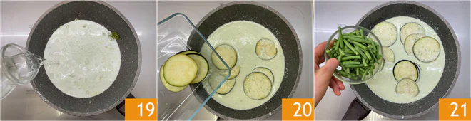 Meanwhile, cut the eggplant into 1/4-inch thick slices 16, trim the green beans and cut them in half 17. Remove the chicken from the pan and set it aside. In the same pan, pour the green curry paste, sauté for a few minutes, then deglaze with coconut milk 18.