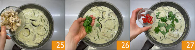 Plate it, and complete with chili pepper 28 and fresh coriander 29. Your Thai green curry is ready to be served 30