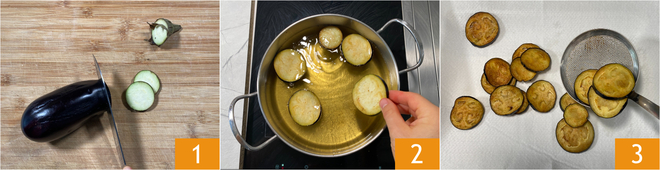 To prepare the cuzzetiello alla parmigiana, first slice the eggplants to a thickness of 0.5-1 inch 1. Pat them dry well and fry in peanut oil 2 at about 340°F for 2-3 minutes. Fry a little at a time to avoid lowering the oil temperature too much. Then transfer them to paper towels 3 to remove excess oil, add a pinch of salt, and set aside.