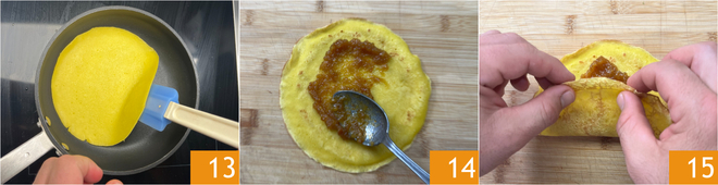 Cook for about a minute until golden, then use a spatula to flip the crepe 13 and cook for another minute. Once cooked, transfer it to a plate and repeat the same steps until the batter is finished. You can top your crepes by placing a tablespoon of jam in the center 14 and then folding them in half 15.