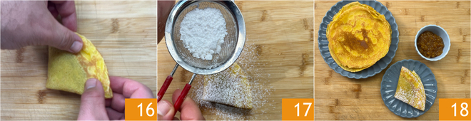 Fold again in half to form a triangle 16 and sprinkle with powdered sugar 17. Your dairy-free crepe is ready to be enjoyed 18!