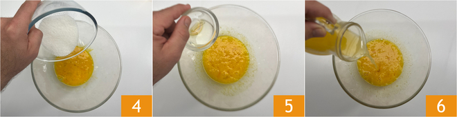 Add the sugar and incorporate it into the eggs 4. Add the sunflower oil 5, the orange juice 6, and mix.