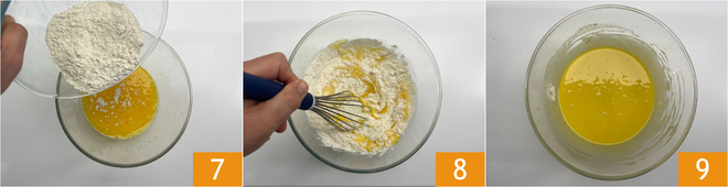 Add the flour 7 and mix vigorously 8 to obtain a smooth batter without lumps 9.