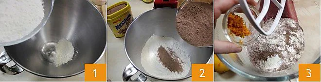 To prepare the sweet Danube with Nesquik, sift the two flours and place them in the bowl of a stand mixer equipped with a paddle attachment 1 (if you do not have a stand mixer, you can knead by hand, using a fork to incorporate the liquids into the flours). Add the Nesquik 2 and the grated orange zest 3