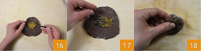 place 10 g of orange marmalade 16 and 6 g of chocolate chips 17 in the center. Close the discs creating little bundles 18. Continue until you finish all the dough.