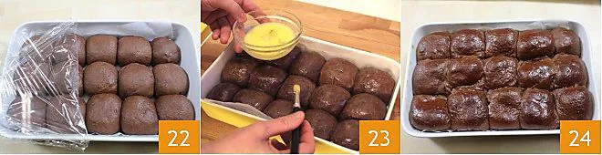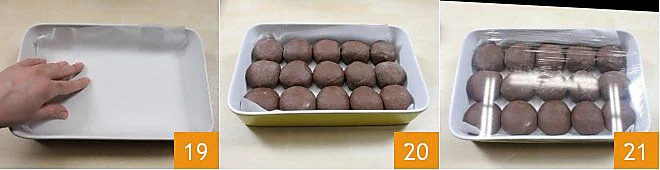 Take a rectangular baking dish measuring 11 x 7 inches, line it with parchment paper 19, and place the bundles inside with the closure facing down so they do not open up and slightly apart from each other, the bundles should almost touch each other 20. Cover the dish with plastic wrap 21 and let the Danube rise again for about an hour in the turned-off oven with the light on (at a temperature of about 77°F).