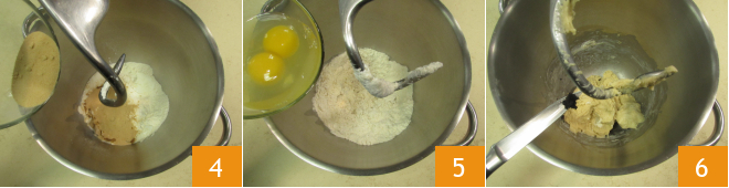 Add the brown sugar 4 and turn on the mixer at medium-low speed to mix the ingredients. Then add the eggs at room temperature, one at a time 5. Wait for one to be absorbed before adding the next. Finally, add a pinch of salt, then the vanilla bean seeds 6.