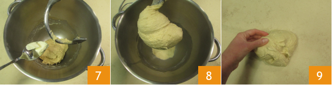 Form a ball 10 and place the dough in a bowl, cover with cling film 11. Let it rise for a couple of hours at room temperature (the ideal temperature is 77/81°F) or until the dough doubles in size 12.