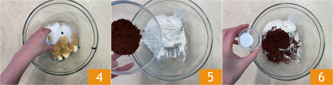 Knead to form a dough 4 and then add the flour, unsweetened cocoa powder 5, and baking soda 6.