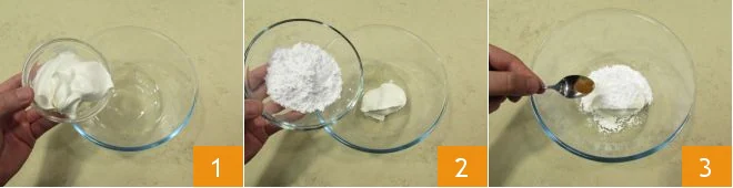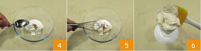 To prepare the dates filled with mascarpone and walnuts, start by pouring the mascarpone 1 and powdered sugar 2 into a large bowl. Flavor with cinnamon 3.