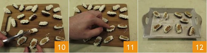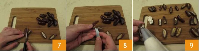 Set the piping bag aside while you prepare the dates. Start by cutting them in half 7: repeat this operation for all the dates. Then remove the inner pits 8: this will give you boat-shaped dates that are ready to be filled. Take the piping bag and start filling the dates in the hollow 9.