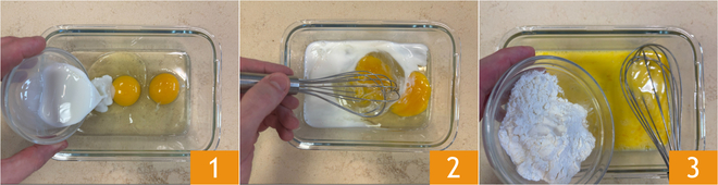 To prepare the deep-fried cod, start by making the batter. In a bowl, pour the eggs and milk 1, then mix with a whisk 2. Add the flour 3 and salt.