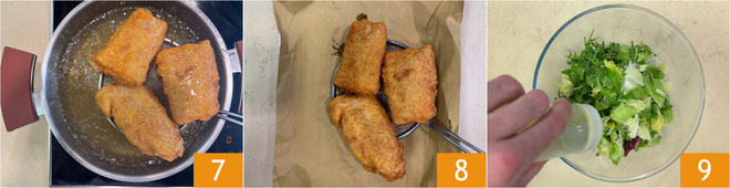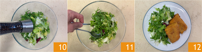 Salt, pepper 10, and mix 11. Your deep-fried cod is ready to be served with a fresh side salad 12!