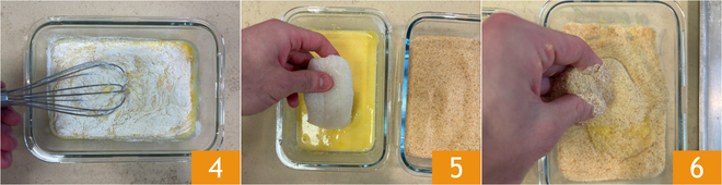 Mix thoroughly to avoid lumps 4. At this point, pass the cod fillets first through the batter 5 and then through the breadcrumbs 6, pressing well to adhere.