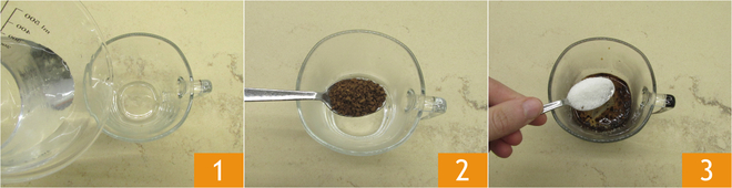 To prepare the indulgent coffee with cream, heat the water 1 and dissolve a teaspoon of instant coffee 2 and two of sugar 3 in it.