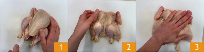 To prepare the deviled chicken with potatoes, first cut it in half lengthwise, through the breast side 1, open it like a book 2, and press it down well with your hands 3.
