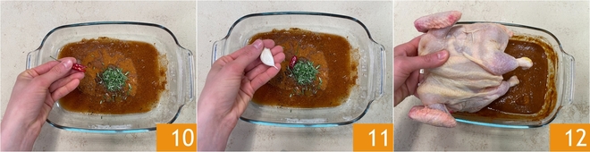 Add the chili pepper 10 and garlic 11. Mix everything until obtaining a homogeneous marinade. Place the chicken inside the baking dish 12.