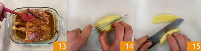 Brush the marinade on both sides, making sure to cover the entire surface evenly 13. Let marinate in the refrigerator for at least an hour, or longer if possible, to allow the flavors to penetrate. After this time, peel and cut the potatoes first in half 14 and then into wedges 15.