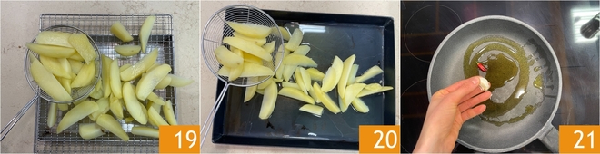 Cook the potatoes in boiling salted water for about 15 minutes, until they are cooked outside but still firm inside 16 17. In the meantime, pour oil and clarified butter into a baking sheet 18 and place it in a preheated oven at 392°F (200°C) for 8 minutes.