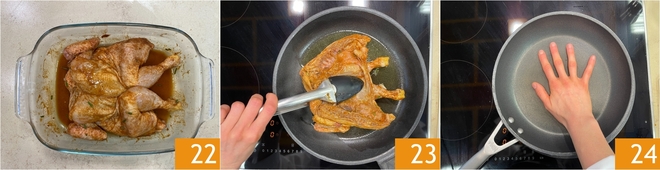 Take the marinated chicken 22 and place it in the hot pan with the skin side down 25. Place a weight (such as another pan or a heavy lid) to press it down during cooking 34.