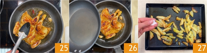 Cook over medium heat for about 30 minutes, turning the chicken halfway through cooking 25 and always covering it with a weight 26. When the potatoes are well-browned, remove them from the oven and season with salt 27.
