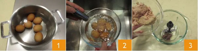 To prepare deviled eggs, start with the preparation of boiled eggs. Take a pot and fill it with plenty of water. Place the eggs inside and bring to a boil, cooking them over medium heat for about 8 minutes. When the eggs are cooked, turn off the heat and remove them from the pot using a slotted spoon. Place them in a bowl and then put the bowl with the eggs under a stream of cold water to cool 2. While the eggs cool, proceed with preparing the spicy filling for your eggs. Take a blender and add the anchovies and tuna 3.