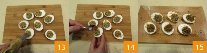 Fill the cavity of the egg white (from which you removed the yolk) with the piping bag 13. Repeat the operation for all the eggs. Finally, sprinkle with paprika 14 and the remaining parsley that you have chopped. The deviled eggs are now ready to be served at the table 15!