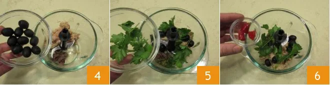 Then add the black olives 4, capers, and some parsley (keep a little aside to sprinkle over the eggs' surface) 5 and the chili pepper cut into strips 6.