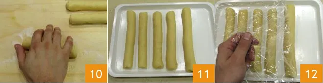shape them into logs about 3/4 inch in diameter 10 and place them on a tray 11. Cover with plastic wrap 12 and refrigerate to firm up for about 30 minutes.