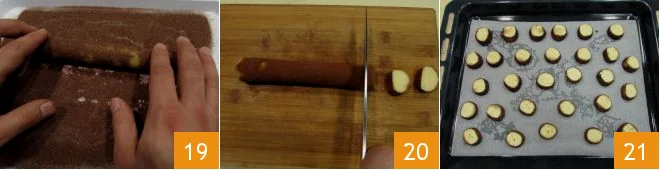Coat the entire surface well so that the cocoa and sugar adhere 19, then cut into discs about 3/8 inch thick 20 and place them on a greased and parchment-lined baking sheet, well spaced 21. Bake in a preheated static oven at 356°F for about 10-12 minutes (if using a fan oven, 320°F for about 4-6 minutes; you can also bake a few at a time to better adjust time and temperature).