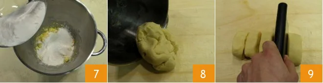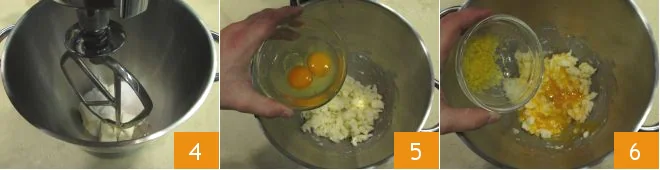start mixing the ingredients with the paddle attachment 4, then add the eggs 5 and the grated lemon zest 6.