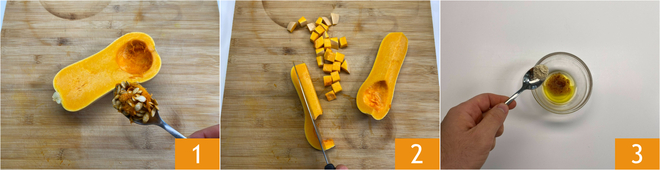 To prepare diced pumpkin in an air fryer, first remove any seeds and internal fibers 1. Also, remove the stem and, without peeling, cut it into cubes about 0.6 inches 2. In a small bowl, pour the oil, the tip of a teaspoon of paprika, and the same amount of garlic powder 3.