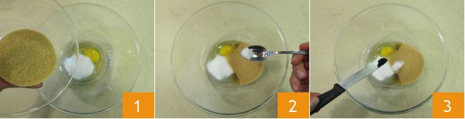 To make the duffins, first melt the butter in a saucepan and start preparing the dough: place the egg in a bowl and add the granulated sugar and brown sugar 1, then add the salt 2 and the seeds from the vanilla bean 3 and mix the ingredients with an electric mixer.