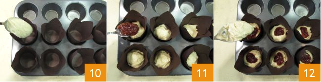 Now take a muffin pan, line it with 8 paper liners, and fill each halfway with the batter 10. Add a teaspoon of jam 11 and cover with the remaining batter 12.