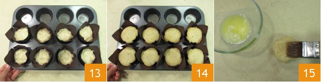 Once ready 13, bake in a preheated static oven at 350°F for about 30 minutes. When they are baked, remove them from the oven and let them cool 14. In the meantime, melt the butter for the garnish, and once the duffins have cooled, brush them with the melted butter 15.