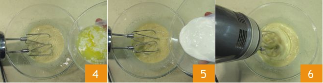 At this point, pour in the melted and cooled butter 4 and the yogurt 5, and mix for a few seconds with the mixer to combine everything 6.