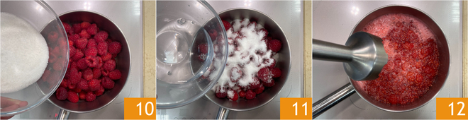 In the meantime, prepare the raspberry jelly: soak the gelatin in cold water. Place the raspberries in a saucepan, then add the sugar 10 and water 11. Bring to a boil and cook over medium-high heat for about 10 minutes. When the raspberries have broken down, turn off the heat and blend with an immersion blender 12.