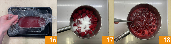 Place in the refrigerator and let it set for an hour 16. Now focus on the sauce for decoration: put the raspberries and sugar in a saucepan 17 and reduce over medium-high heat for about 10 minutes until it has a jam-like consistency 18.
