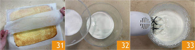 Remove from the oven and flip the biscuit onto another sheet of parchment paper 31, then immediately cover with cling film; this way, it will remain moist and elastic. Let cool, then cut out the biscuit with a 21 cm oval mold. To make the Bavarian cream, pour the cream and sugar into a bowl 32, then semi-whip the mixture with an electric mixer 33.