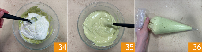 Add the semi-whipped cream to the custard in 3 parts 34, stirring to achieve a homogeneous mixture 35. Transfer the Bavarian cream into a piping bag 36.