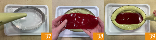Place the same oval mold used for the biscuit on a tray with parchment paper and line it with cling film. Fill the mold with more than half of the Bavarian cream 37, leaving a space in the center where you will insert the raspberry jelly 38. Cover with the remaining Bavarian cream 39.