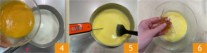 Pour the egg yolk and sugar mixture into the saucepan with the milk 4 and heat to 185°F, stirring constantly to prevent it from sticking to the bottom 5. Transfer everything into a bowl, add the well-wrung gelatin sheets 6, and stir to dissolve completely.