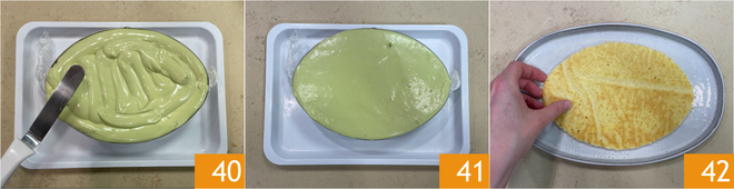 Smooth the surface 40 41 and let it set in the freezer for 8 hours. After chilling, place the biscuit on a serving plate 42.