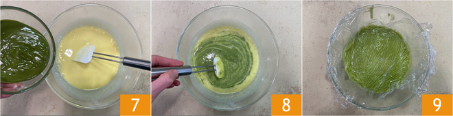 Add the pistachio paste 7 and mix well 8. Cover with cling film in contact 9 and place in the refrigerator to cool for an hour.
