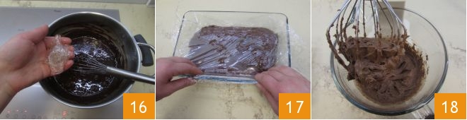 Squeeze the gelatin sheets well and add them to the still-hot cream 16; after mixing well to dissolve it completely and incorporating it, transfer the cream to a shallow bowl and cover with plastic wrap in contact with the surface 17: first let it cool at room temperature, then put it in the fridge for 2 hours. After this time, pour the cream into the stand mixer bowl and let the whisk work a bit to soften it 18.
